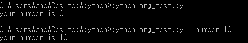 .py 뒤에 --number 10 을 적어주면 arg.number 이 10이라는 뜻으로 파싱하고, 결과로 10을 출력해준다.